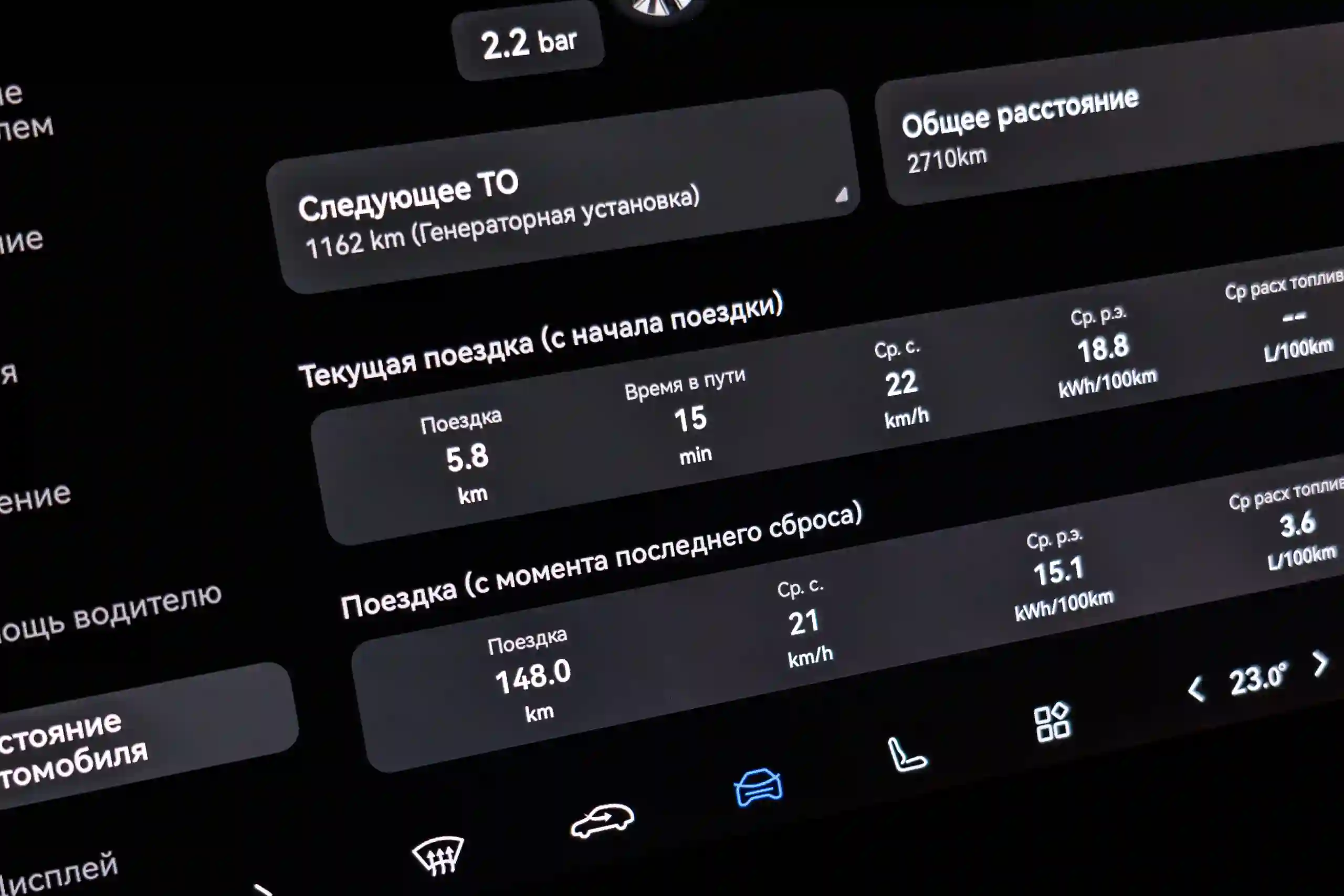 У новой модели в автоматическом режиме тише работает кондиционер и чуть мощнее замедление при стандартном среднем уровене рекуперации. Это может служить объяснением, почему она оказалась экономичнее дорестайлинговой в мерном параллельном заезде в режиме EV при одинаковых настройках. Первая «привезла» расход (по БК) 18,8 кВт·ч/100 км, а старая, обутая в точно такие же шины с тем же давлением — 21,2 кВт·ч/100 км.