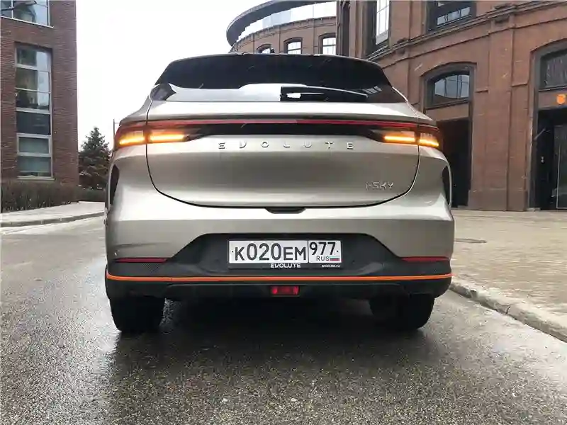 Внешность у EVOLUTE i‑SKY футуристическая, но не вычурная. Длина – 4565 мм, ширина 1860 мм, высота 1680 мм. Колёсная база 2715 мм, клиренс 175 мм. Кросс-купейного типа кузов, огромные светодиодные полумесяцы передней светотехники, массивная горизонтальная «штанга» задней, во всю ширину кузова. Изящная волна выштамповки по всей боковине кузова от носа до кормы, с повышением в конце. Оранжевые молдинги каймой идут по пластиковому обвесу кузова. Вид спереди – на любителя, сзади – твёрдая четверка, профиль навевает воспоминания, например, об Audi Q5, в общем, за экстерьер – четвёрка с плюсом как минимум.